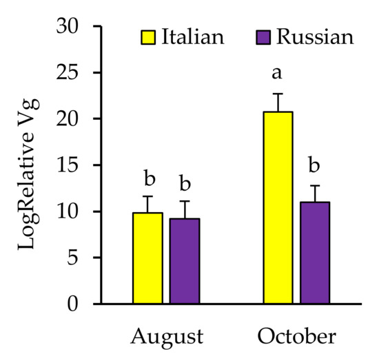 Relative amount (mean ± SE) of Vg (the gene encoding for the yolk-precursor protein, vitellogenin) in newly emerged bees from Italian and Russian colonies in August and October 2016. Bars with the same letters are not significantly different (p > 0.05).