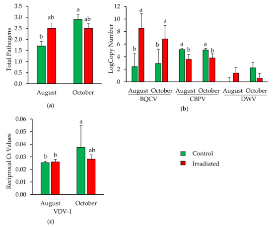 Pathogen loads for newly emerged bees from colonies having irradiated or non-irradiated (control) combs in August and October 2016: (a) Total number (mean ± SE) of pathogens detected; (b) levels (mean ± SE) of Black queen cell virus (BQCV), CBPV and Deformed wing virus (DWV); and (c) VDV-1. Bars without letters are not significantly different (p > 0.05).