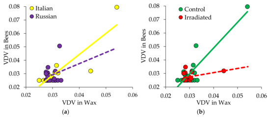 VDV-1 levels were positively correlated for newly emerged bees and wax collected from the same comb for samples from: (a) Italian colonies (yellow, solid line), but not for samples from Russian colonies (purple, dashed line), and (b) colonies with control (green, solid line) combs, but not from colonies with irradiated (red, dashed line) combs.
