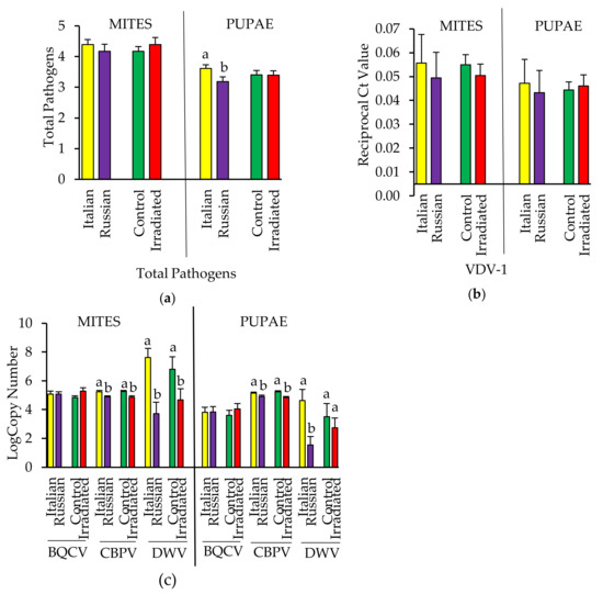 (a) Total number (mean ± SE) of pathogens detected; (b) levels (mean ± SE) of VDV-1 and (c) other viruses in mites and their pupal hosts collected from Italian and Russian colonies having either irradiated or non-irradiated (control) combs. For each group, bars with the same letters are not significantly different (p > 0.05); without letters indicates no differences.