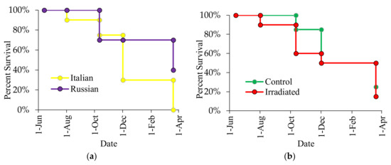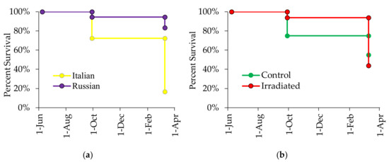 The same trend was observed during the 2016 experiment. By March 2017, all Italian colonies had died whereas 40% of the Russian colonies were still alive (χ2 = 9.79, p = 0.002; Figure 11a), seven of which were still alive in June 2017 (four control, three treated). No influence of comb irradiation on colony survival was also detected (χ2 = 0.54, p = 0.463; Figure 11b). The abrupt decline in colony survival was observed in October 2016 due to a historic flooding in the area about 2 weeks after the colony evaluation in August 2016. Although adult bees of these flooded colonies (one Italian and six Russians) moved up the top boxes, they eventually succumbed to small hive beetle infestations that attacked the decomposing brood at the bottom brood chamber as flood water slowly receded. There were 29 colony survivors in October 2016 (Russian Control: 8, Russian Irradiated: 6; Italian Control: 9, Italian Irradiated: 6). Although there were 14 Russian colonies (range adult infestation = 0.4% to 5.9%) and 15 Italian colonies (range adult infestation = 0.3% to 55%) alive during the observations in October 2016, no Italian colony survived in March 2017, likely due to high Varroa parasitism with the exception of two colonies that died even though they had levels below the economic treatment threshold. In contrast, eight Russians (five control, three irradiated) colonies overwintered successfully (March 2017), seven of which were still alive in June 2017 despite having a range of 0.6% to 3.6% adult infestation in October 2016.