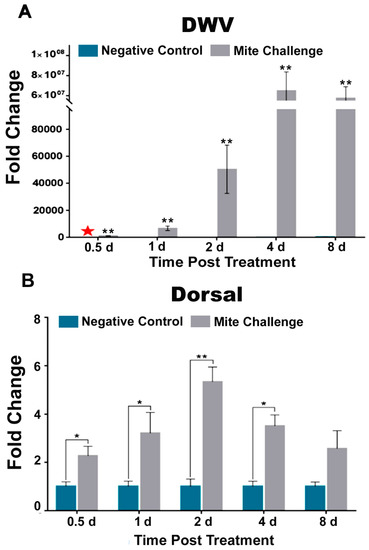 The concentration of DWV and the expression levels of the transcription factor Dorsal. (A) Fold changes of DWV between the negative control (without Varroa challenge) and the groups challenged with Varroa mites at the different time points post treatment. Bees infested with Varroa mites show significantly higher levels of the DWV compared to bees without exposed to Varroa challenge (star denotes calibrator; ** p < 0.01). (B) Fold changes between the negative control (cyan) and challenged bees (grey) at the different time points post treatment (* p < 0.05, ** p < 0.01).