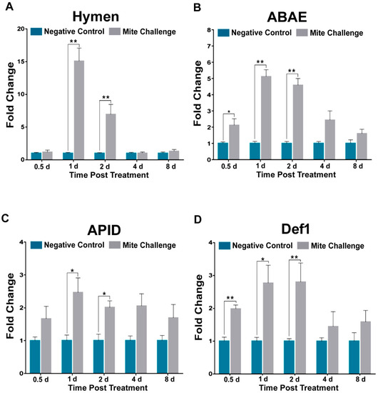 At every time point, DWV levels were significantly higher (p < 0.01) in bees exposed to Varroa (Figure 1A). More specifically, viral levels increased rapidly after 0.5-day post treatment, and reached their maximal levels at four days (Figure 1A). Dorsal, a transcription factor associated with the active expression of immune effector molecules, has been previously shown to be linked to high Varroa infestation and DWV concentrations [20]. Here we observed that Dorsal transcript levels significantly (p < 0.05) increased at approximately two-fold 0.5 days post treatment and peaked (p < 0.01) at nearly six-fold two days post treatment (Figure 1B). After which, levels began to drop and DWV levels rose (Figure 1). The aforementioned study [20] employed Abaecin as a readout for Toll immune response in Varroa infested bees. Here we probed Hymenoptaecin (Hymen), Abaecin (ABAE), Apidaecin (APID), and Defensin 1 (Def1) as output relative to the down-regulation of Toll immunity. We observed that Hymen and ABAE transcriptional levels were elevated between 15-fold (p < 0.01; former) and five-fold (p < 0.01; latter) within the same window of DWV concentration increase and peak Dorsal expression (1-2d post treatment Figure 1A,B). A similar pattern was observed one and two days post treatment for two more AMPs, APID (p < 0.05) and Def1 (p < 0.01 and p < 0.05 respectively) (Figure 2C,D). The noted increases in expression at day 1 and day 2 post challenge were followed by decreases to levels similar to those of the uninfested bees by day 4 for each of the AMPs (Figure 2) and day 8 for Dorsal (Figure 1B) as DWV levels reached to peak (Figure 1A).