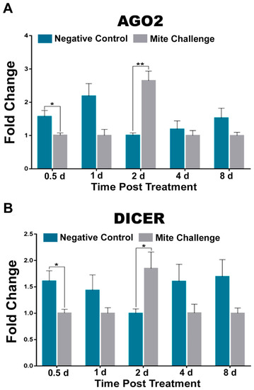 Fold change of the transcription profiles for components of RNAi pathway between the negative control (without Varroa challenge) and bees challenged with Varroa mites at different time points post treatment (days). (A) dsRNA binding AGO2 and (B) ribonuclease Dicer transcripts demonstrating down-regulation at all timepoints, except for significant upregulation two days post treatment. (* p < 0.05, ** p < 0.01).