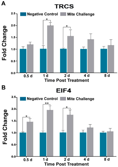 Fold chance of the transcription profiles for pieces of TOR pathway between the negative control (without Varroa challenge) and bees challenged with Varroa mites at different time points post treatment (days). (A) TOR subunit TRCS and (B) translation initiation factor EIF4 demonstrating similar expression patterns to Toll pathway components of immunity (* p < 0.05, ** p < 0.01).