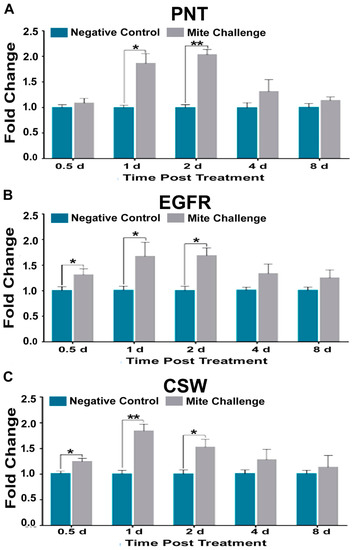Fold chance of the transcription profiles for parts of cellular proliferation and growth pathway (EGFR) between the negative control (without Varroa challenge) and bees challenged with Varroa mites at different time points post treatment (days). (A) growth factor pointed (PNT), (B) receptor (EGFR), (C) and phosphatase corkscrew (CSW), demonstrating similar expression patterns to Toll pathway components of immunity (* p < 0.05, ** p < 0.01).