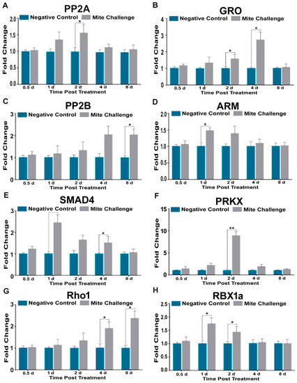 Fold chance of the transcription profiles for multiple elements of Wnt signaling between the negative control (without Varroa challenge) and bees challenged with Varroa mites at different time points post treatment (days). (A) phosphatase 2A (PP2A), (B) transcriptional repressor groucho (GRO), (C) phosphatase 2B (PP2B), (D) segment polarity gene armadillo (ARM), (E) transcription factor SMAD4, (F) kinase PRKX, (G) GTP binding protein Rho1, and (H) E3-ubiquitin ligase RBX1a demonstrating similar expression patterns to Toll pathway components of immunity (* p < 0.05, ** p < 0.01).