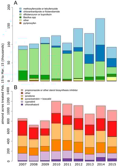 Insecticide (A) and fungicide (B) use on California almonds for the years 2007–2015 during the blooming period (15 February–15 March). Data downloaded from the California Pesticide Information Portal [4].