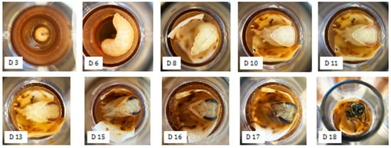 Photos of honey bee larval development reared in vitro. “D” corresponds to days after larval transfer.