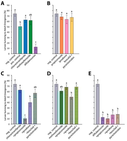 Effects of insecticides, fungicides, and combination treatments on larval survival. Average percent larvae surviving to adult emergence is shown, with error bars displaying standard error. Treatments with different letters indicate significantly different levels of adult emergence (p < 0.05). Negative solvent control (N = 130) and insecticide-only results are reproduced across subplots. (A) Insecticide treatments (dimethoate positive control N = 130; chlorantraniliprole N = 131; methoxyfenozide N = 114; diflubenzuron N = 63); (B) fungicide treatments (propiconazole N = 63; iprodione N = 47; boscalid and pyraclostrobin N = 47); (C) chlorantraniliprole combination treatments (+propiconazole N = 146; +iprodione N = 48; +boscalid and pyraclostrobin N = 63); (D) methoxyfenozide combination treatments (+propiconazole N = 79; +iprodione N = 63; +boscalid + pyraclostrobin N = 63); and (E) diflubenzuron combination treatments (+propiconazole N = 63; +iprodione N = 63; +boscalid and pyraclostrobin N = 47).