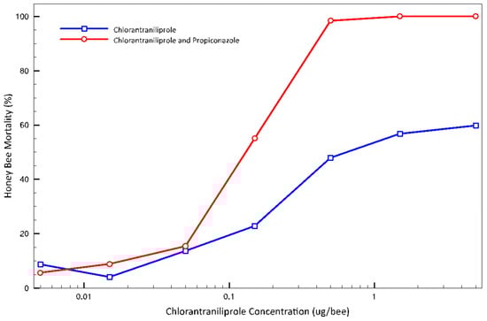 Dose-response curves for topical treatment of adult worker honey bees with chlorantraniliprole (N = 697) or chlorantraniliprole mixed with propiconazole (N = 476) at a 1:2.25 ratio.