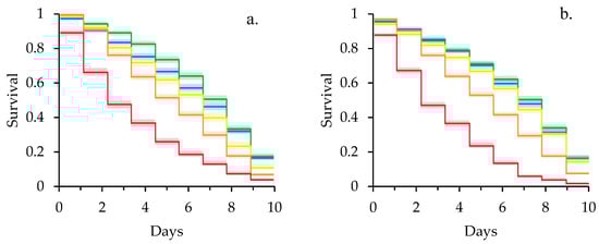 Kaplan-Meier survival curves for adult bees fed clothianidin reared in (a) pollen deprived and (b) pollen supplemented colonies. Shading represents 95% Confidence Intervals. Blue = 0 µg/L, Green = 10 µg/L, Yellow = 40 µg/L, Orange = 200 µg/L, Red = 400 µg/L.