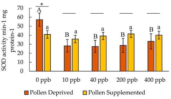 Activity of superoxide dismutase in 4th/5th instar honey bee larvae (mean ± SE). Letters indicate significant differences between feeding treatments within a replicate.