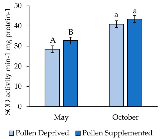 To our knowledge, this is the first study to report SOD activities in honey bee larvae. Overall, these were comparable to concentrations in adult honey bees. Concentrations were lower in May than October, when heavy rains caused a pollen dearth across the apiary and surrounding landscape relative to amounts normally collected in previous years, though significant differences between feeding treatments were only seen in May, where SOD was higher in larvae from pollen supplemented colonies. This increase may indicate a rescue effect resulting from the necessary protein components being present to generate the enzymes for stress mitigation (Liao et al., 2017), though further research into the optimal concentrations of SOD in honey bees is needed. From our results, it would appear that SOD activity in larvae is a good indicator of sublethal stress associated with pollen dearth during development, and thus assays could be further developed to evaluate colony-level feeding stress for larvae.