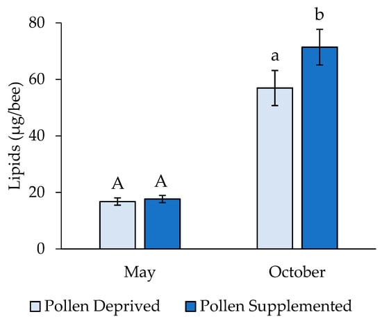Larval lipid levels also differed significantly between seasonal replicates (Wilcoxon Z = −6.19, p < 0.001), and thus they were analyzed separately. In May, there was no significant difference in larval lipids between feeding treatments (t = 0.50, df = 119, p = 0.619), though larvae reared in pollen supplemented colonies had significantly greater lipid levels in October (t = 2.32, df = 159, p = 0.021) (Figure 4). Adult lipid levels were unaffected by larval feeding treatment and clothianidin dose (2-way ANOVA: F = 1.37, df = 9,176, p = 0.2035; pollen supplemented: 19.5 ± 2.38 µg/bee, pollen deprived: 23.1 ± 2.67 µg/bee).