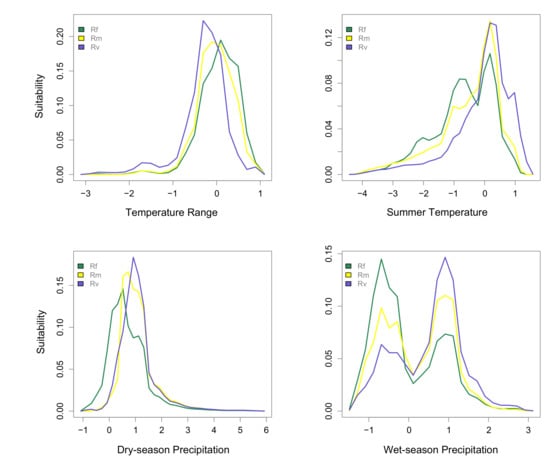 Predicted niche occupancy. Four environmental factors were used to estimate niche occupancy of R. flavipes (Rf), R. malletei (Rm), and R. virginicus (Rv): top two panels: temperature range and summer temperature; bottom two panels: dry- and wet-season precipitation. The y-axis represents niche occupancy, or suitability, and the area under the curves sums to 1, the total suitability.
