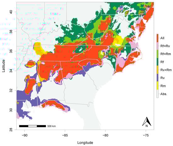 Distributional overlap of R. flavipes (Rf), R. malletei (Rm), and R. virginicus (Rv). Overlap is color coded based on the number of species. “All” is where occurrence of all three species is predicted. Areas of two-species overlap are shown in the legend as “Rf + Rv”, “Rf + Rm”, and “Rv + Rm”. Absence of all three species is shown in grey and referred to in the legend as “Abs.”