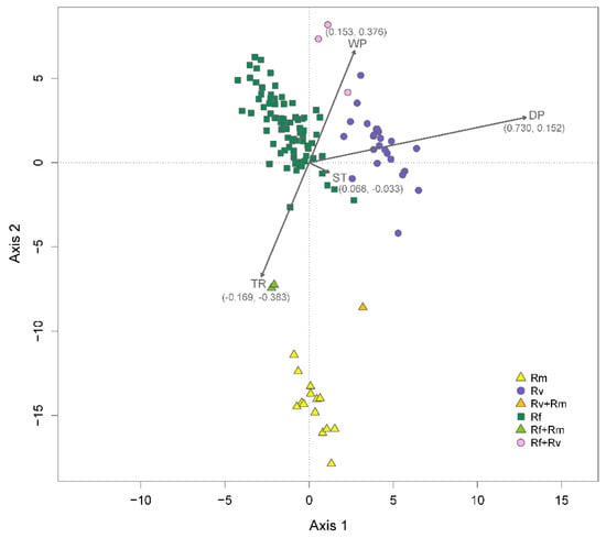 Distance-based redundancy analysis. The plot shows a constrained ordination of 132 sampling sites, color coded based on the number of species present. Sites where only R. flavipes, R. virginicus, or R. malletei were sampled are referred to in the legend as “Rf”, “Rv”, and “Rm”, respectively. Two-species sites are shown in the legend as “Rf + Rv”, “Rf + Rm”, and “Rv + Rm”. The ordination is conditional on six significant spatial components (PCNM axes 1, 4, 6, 17, 43, and 58) and constrained by four environmental factors: dry-season precipitation (DP); wet-season precipitation (WP); summer temperature (ST); temperature range (TR). Arrows show strength of correlation (coefficients in parentheses) of environmental factors with ordination axes 1 and 2.
