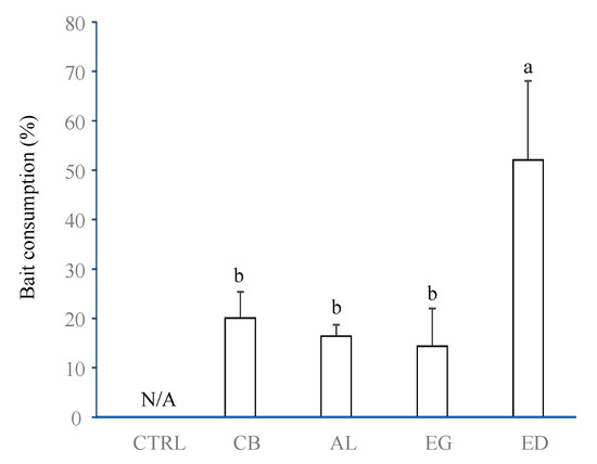 Rate of organic resource consumption by termites, in % of the initial organic resource weight loss (elephant dung (“ED”), acacia leaves (“AL”), elephant grass (“EG”) and cardboard (“CB”)), Error bars represent the standard error of the mean. Histograms with the same letter are not significantly different at p ≥ 0.05 (n = 5). N/A for non-applicable in the case of the control.
