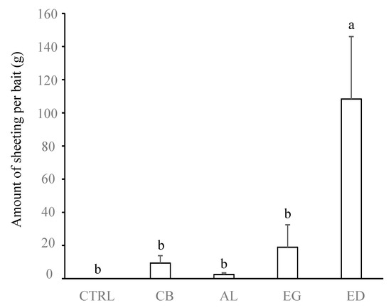 Amount of termite sheeting (g) for each treatment. Treatments are: control (“CTRL”), elephant dung (“ED”), acacia leaves (“AL”), elephant grass (“EG”) and cardboard (“CB”). Error bars represent the standard error of the mean. Histograms with the same letter are not significantly different at p ≥ 0.05 (n = 5).