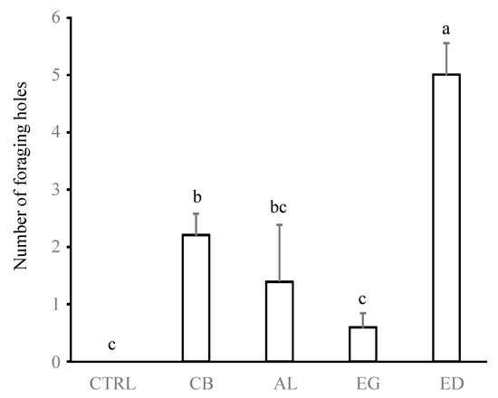 Number of foraging holes observed on the soil surface. Treatments are: control (“CTRL”), elephant dung (“ED”), acacia leaves (“AL”), elephant grass (“EG”) and cardboard (“CB”). Error bars represent the standard error of the mean. Histograms with the same letter are not significantly different at p ≥ 0.05 (n = 5).