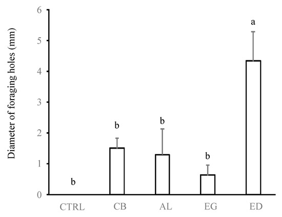 Average diameter of foraging holes (in mm). Treatments are: control (“CTRL”), elephant dung (“ED”), acacia leaves (“AL”), elephant grass (“EG”) and cardboard (“CB”). Error bars represent the standard error of the mean. Histograms with the same letter are not significantly different at p ≥ 0.05 (n = 5).