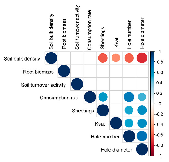The diameter and number of holes were identified as the most important factors associated with Ksat (PLSR model, Q2 = 0.52, Root Mean Square Error of Prediction (RMSEP) = 0.042, Table 2), which is in line with the general assumption that a higher soil macroporosity increases the soil hydraulic conductivity [49].