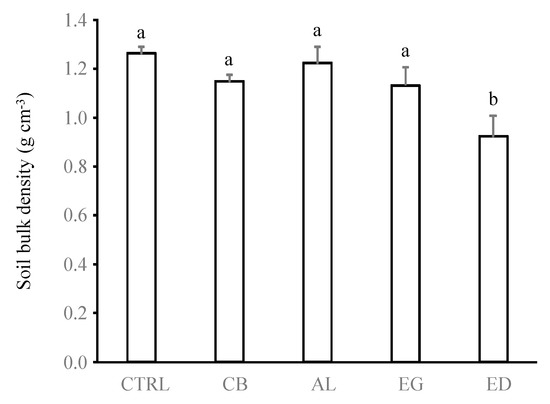Soil bulk density (g cm−3) below the treatments (control (“CTRL”), elephant dung (“ED”), acacia leaves (“AL”), elephant grass (“EG”) and cardboard (“CB”)). Error bars represent the standard error of the mean. Histograms with the same letter are not significantly different at p ≥ 0.05 (n = 5).