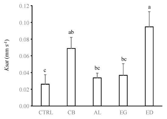 Soil hydraulic conductivity (Ksat, in mm s−1) for the different treatments (control (“CTRL”), elephant dung (“ED”), acacia leaves (“AL”), elephant grass (“EG”) and cardboard (“CB”)). Error bars represent the standard error of the mean. Histograms with the same letter are not significantly different at p ≥ 0.05 (n = 5).