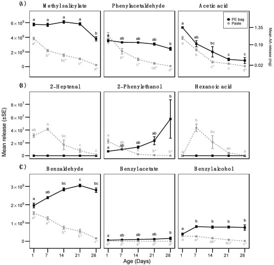 Mean release rate (±SE) of (A) methyl salicylate (MS), phenylacetaldehyde (PAA), and acetic acid (AA) from two different emitting devices at five different ages of field exposure (N = 5). The semi-quantitative release of AA is shown on the right y-axis. Letters above points indicate significant differences between ages of the same formulation and * significance between formulations at a given age (LRM and GLS, Tukey’s test, p < 0.05). (B) Mean release rate (±SE) of 2-heptenal, 2-phenylethanol, and hexanoic acid. (C) Mean release rate (±SE) of benzaldehyde, benzyl acetate, and benzyl alcohol. 2-heptenal and hexanoic acid were exclusively found in Paste.