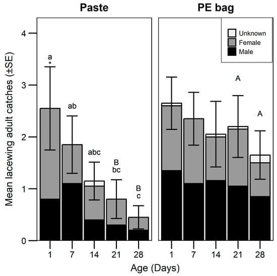 Mean catches (±SE) of lacewing adults in apple orchards by two different emitting devices at 1, 7, 14, 21, and 28 day of field exposure (N = 5). The lower part of the bar indicates the proportion of males, middle the proportion of females, and top the proportion of individuals that could not be sexed. Different uppercase letters above the bar indicates a significant difference of catches between the two formulations at a given age (GLMM, Tukey’s test, p < 0.05). Different lowercase letters indicate significant differences between ages within the same formulation (GLMM, Tukey’s test, p < 0.05). An * above bars indicate significant higher ratio of females at the corresponding age (GLM, Tukey’s test, p < 0.05).