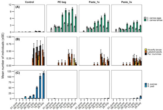 Mean number (±SE) of (A) lacewing, (B) other natural enemies, and (C) aphids observed on three barley plants during the experiment.