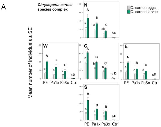 A total of 983 lacewing eggs and 1965 larvae were recorded in the barley fields. The number of eggs and larvae changed over time and differed between treatments (Figure 3A, Table 1). The abundance of immature lacewing stages varied between sectors (Figure 4A, Table 1). The most lacewing eggs and larvae were recorded with the reference formulation, followed by paste_1x and paste_3x. Very low numbers were found in control plots (Figure 4A). Eggs and larvae clustered close to the lure (sector C), while in the control plot they appeared evenly distributed in all sectors. However, this difference is only statistically supported for eggs in treatments with the PE bag formulation and paste_1x, except for the north sector of paste_1x, and for larvae in the same treatments (Figure 4A).