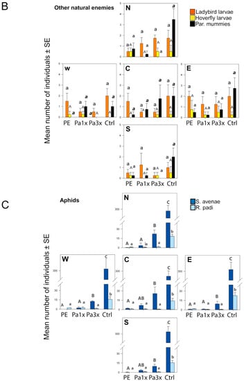 Cumulated number of individuals (±SE) of natural enemies and aphids measured on three barley plants in the central (C) sector of the plot and on plants located at 30 cm north (N), south (S), east (E), and west (W) from the central sector. Different letters above bars indicate significant differences between formulations in each sector for (A) lacewing eggs (lowercase) and larvae (uppercase) (GLMM, Tukey’s test, p < 0.050), (B) ladybird (lowercase), hoverfly larvae (uppercase), parasitoid mummies (bold lowercase) (GLMM, Tukey’s test, p < 0.050), (C) S. avenae (uppercase) and R. padi (lowercase) (GLMM, Tukey’s test, p < 0.050).
