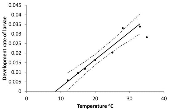 The larval development time (Series 1) was clearly dependent on temperature (T) as can be described by the equation on the development rate (Rlarva) for all larval instars as a function of temperature, at all temperatures except 35 °C, as this temperature appeared to be outside the interval which can justify a straight line (Figure 1).
