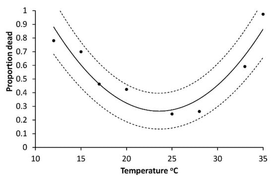 Proportion mortality through of all larval instars (from neonate until pupation) of Agrotis segetum at eight different temperatures. Proportion dead = 2.81957 − 0.2167T + 0.0046T2, R2 = 0.874, F = 17.36, p = 0.0056. The dashed lines above and below represent the upper and lower 95% confidence bands.