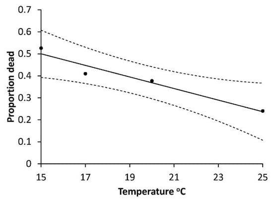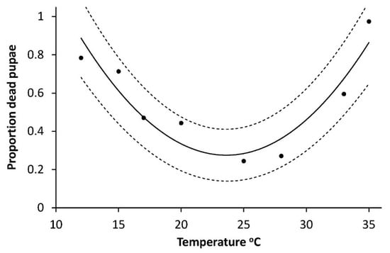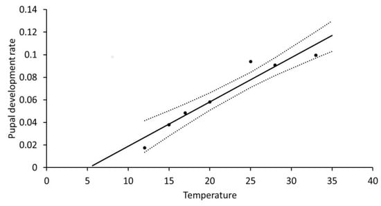 Also, the mortality of pupae had a curve linear dependency of temperature (Figure 6) but with the minimum between 20 and 25 °C (modelled as Mpupa = a + bT + cT2, (Mpupa = 3.3658 − 0.2904 × 0.0062, R2 = 0.817, F = 11.28, p = 0.0140). The highest mortalities occurred at the lowest and the highest temperatures, respectively (Figure 6).