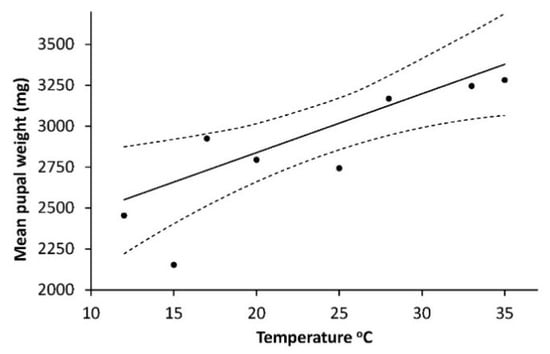 As shown on Figure 4, the weight of pupae (Wpupae) (mg) had a positive linear relationship to temperature: Wpupa = 2119.423 + 35.956T, R2 = 0.688, F = 13.25, p = 0.0011.