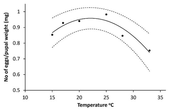 Influence of sex had no effect (F = 0.07, p = 0.7894) on pupal weight and was removed from the final model. The logarithm of number of eggs (Negg) per mg pupae (log10(Negg)/Pweight) had a curve linear dependency on temperature with a maximum between 20 °C and 25 °C: (log10(Negg)/Pweight = 0.0630077616 + 0.08108075T − 0.001835228T2 (R2 = 0.866, F2,3 = 11.4, p = 0.049) shown on Figure 5.