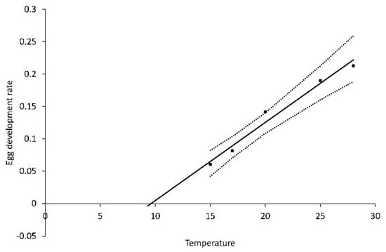 From series 3, the development rate of eggs (Reggs) was modeled as: Reggs = 0.1130 + 0.0121T, R2 = 0.854, p < 0.0001. (Figure 8). The heat requirement was 83 DD over a base temperature (T0) of 9.3 °C.