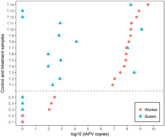 Israeli acute paralysis virus (IAPV) titers of worker and queen samples in control and treatment groups. IAPV-inoculated workers developed virus titers in the range of 7.62 × 106 to 3.91 × 109 copies/µL. Queens in trophallactic and direct physical contact with infected workers became also infected (IAPV titers ranged from 9 × 101 to 1.25 × 109 copies/µL). Two queens with infected workers showed no detectable virus. Queens in the control cages remained uninfected, even though accompanying workers in three experimental cages showed a low level of IAPV (1.09 × 102 to 2.78 × 102 copies/µL). Thus, IAPV titers were lower in queens than in the corresponding workers in 14 cases, while the opposite was true in only 3 cases. T = IAPV-infected workers, C = control workers.