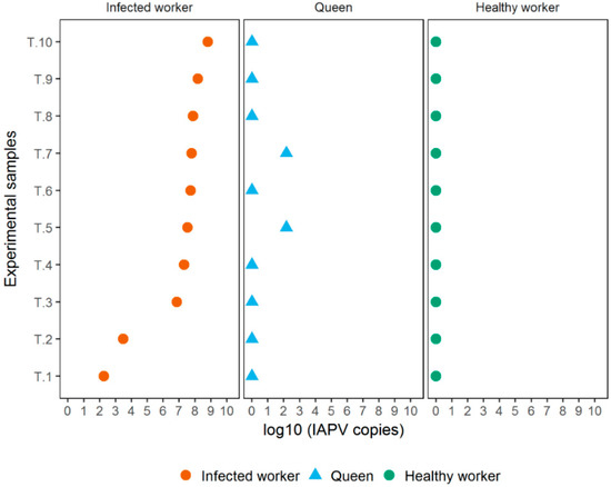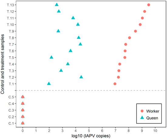 IAPV symptoms of workers started 3 d after inoculation, as described above, with the death of majority of workers in each cage by the experimental termination. Daily observation confirmed trophallactic feeding of queens by the worker bees through the metal mesh screen. Trophallactic feeding is known as a common oral–oral virus transmission route, but our experiment was not able to control for any transmission that may have occurred via an airborne route (if any). IAPV titers of infected workers in experimental cages ranged from 9.2 × 106 to 3.25 × 109 copies/µL, with an average of 5.62 × 108 copies/µL (Figure 2). All queens were infected, with IAPV titers ranging from 9.3 × 101 to 2.59 × 104 copies/µL, and an average of 7.28 × 103 copies/µL (Figure 2). Worker and queens in control cages remained absent of IAPV. There was a significant difference between queens in contact with infected workers and the ones in control group (Fisher’s exact test; p = 0.0001). Across experimental replicates, the IAPV titer of queens was not positively correlated to the IAPV titer of the corresponding workers (r = −0.28, n = 13, p = 0.05). RPS5 amplified consistently in all queens (Ct value 20.04 ± 1.8 (SD)) and workers (Ct value 23.64 ± 1.6).