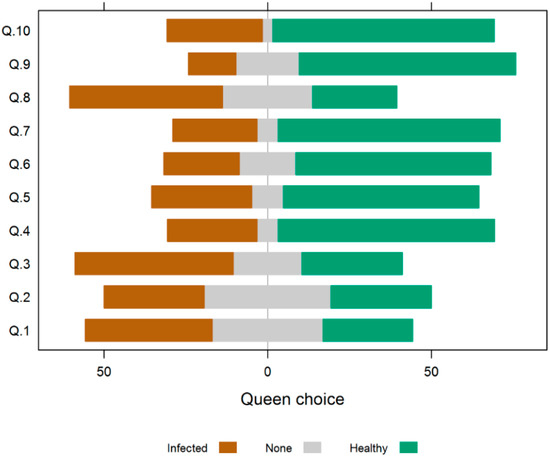 Honey bee queen tendency to associate with healthy or infected workers. For each queen (Q1–Q10), the percentage of time that this queen was in contact with infected workers, healthy workers, or neither group, is indicated by the length of the colored bars. Even though the majority of queens tend to spend more time with healthy workers, the overall preference for healthy workers was not statistically significant (p = 0.058), Brown bars to the left = percentage time spent with infected workers, green bars to the right = percentage time spent with healthy workers. The order of independent trials (Q1–Q10) corresponds to the order in Figure 3).