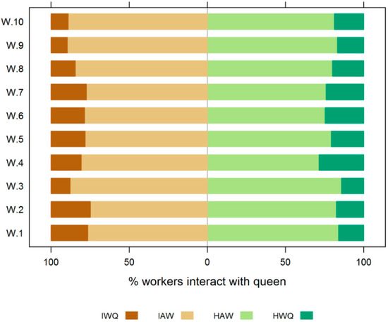 Attendance behavior of infected and healthy workers towards the queen. A small portion of healthy and infected workers stayed close to the screen in contrast to the majority of workers in both groups that did not attend across all trials and days, and there was no significant difference between inoculated and control workers with regards to queen attendance (p = 0.320). IWQ: infected workers interact with queen, IAW: infected workers away from queen, HAW: healthy workers away from queen, HWQ: healthy workers interact with queen.