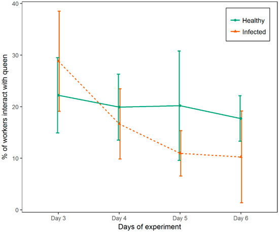 The European honey bee, Apis mellifera, lives in colonies containing several thousand, closely related workers typically derived from a single queen. The queen is central to the colony, releasing pheromones and producing all of the eggs that replenish and grow the colony workforce and produce sexuals for the next generation [1,2]. The non-reproductive members of the colony, the worker bees, perform all other colony tasks, including queen care [1]. The queen’s pheromones attract a retinue of worker bees to attend the queen by antennating, grooming, and feeding her, which includes close physical contact and liquid food transfer via trophallaxis [3,4,5]. These retinue behaviors facilitate the spread of the queen pheromones to the rest of the colony, but the worker–queen interactions are also crucial for maintaining queen health and (presumably) responsible for facilitating the exceptional longevity of the queen [6,7,8]. Since retinue workers are typically young with little contact to the outside world, they may provide a social barrier to protect the queen and lower her exposure to infectious diseases [9,10]. Nevertheless, any physical contacts and trophallactic interactions have the potential for horizontal disease transmission to compromise queen health [11,12].