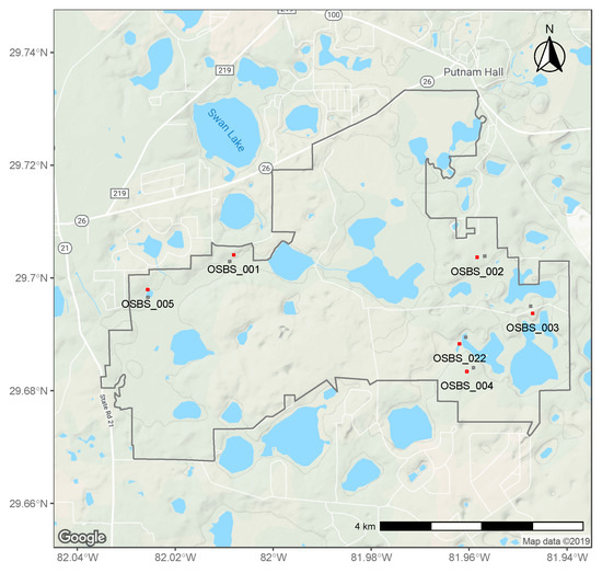 As part of NEON’s implementation strategy, the U.S. was divided in 20 ecoregions [9,10], with Florida largely falling into the Southeast domain. Each of these domains collects standardized data across multiple sites within the domain. The Ordway-Swisher Biological Station (OSBS) is located in North-Central Florida, just outside the town of Melrose in Putnam County. The OSBS covers a little over 38 km2, and the sampling in this location started in 2013. The location contains a tower site and distributed sites for the collection of a variety of data. The tower site contains a flux tower that measures physical and chemical properties on a continuous basis, and also collects atmospheric data, e.g., precipitation, temperature, etc. The distributed site measurements include such variables as vegetation structure, mammal or arthropod occurrences per unit effort, and biogeochemical characteristics. There are a number of distributed sites within the tower site and a number of distributed sites throughout the OSBS. This study only used data from the distributed sites outside the tower site. The data downloaded is reflected in Table 1 [11].