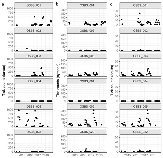 Hard-bodied tick counts at Ordway Swisher Biological Station (Florida) from 2014 to 2018 at each of six sampling sites, separated in (a) larvae, (b) nymphs and (c) adults.