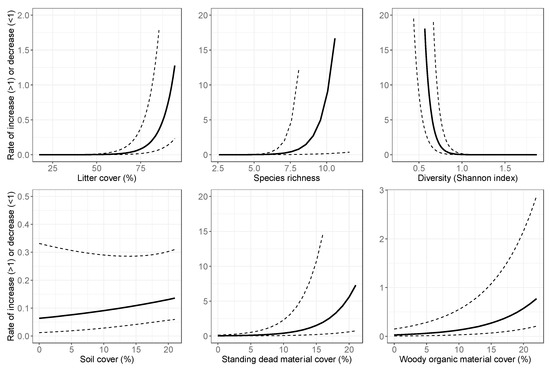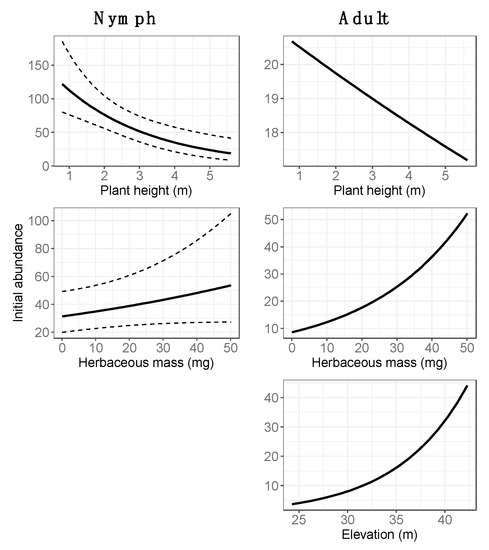 Based on the model selection procedures, the initial abundance estimates for nymphs were modeled with the average height of woody vegetation and herbaceous mass, and for adults the abundance estimates were modeled with elevation, the average height of woody vegetation and herbaceous mass. The annual growth of nymph abundance was affected by litter cover, species richness, diversity, soil cover, standing dead material cover and woody organic material cover, whereas the annual growth of adult abundance was only affected by the mean nymph abundance and litter cover. Since the site-level variables were not standardized before model development, it was not straightforward to interpret numeric outputs (coefficients) from the models. Instead, Figure 3, Figure 4 and Figure 5 illustrate the relationships between the variables and the initial abundance or growth, modeled with log-link functions. These results show the relationship with each variable separately, while all other variables are held at their average value. The detailed statistical outputs of the models can be found in the Supplementary Tables S7–S10.