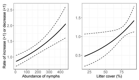The annual abundance estimates for nymphs showed more variation over the study period, which is potentially related to a higher sensitivity to yearly site variables. The nymph model contained 6 yearly site variables, while the adult tick model contained only 2 site variables. The adult tick population growth was driven by the number of nymphs and litter cover, implying that other site (habitat) variables were less important. The population growth of nymphs on the other hand showed the relationships with habitat variables, such as litter cover and cover of woody organic material and standing dead material. Note that in the results, the values of >1 indicate population growth, as this is the factor with which the previous year’s population is multiplied. The values of <1 indicated decline (Supplementary Methods). The soil cover and the cover of woody organic material caused a decline in the ticks for our study sites (values < 1 in Figure 4). The litter cover > 70% caused increases in adult tick populations, and > 92% was linked to increases in nymph populations. The standing dead material > 14% was related to increased nymph populations. The standing dead material also included desiccated herbaceous organic material (from the previous year) [39] which could be driving this relationship. The NEON data do not specify whether the material was woody or herbaceous.
