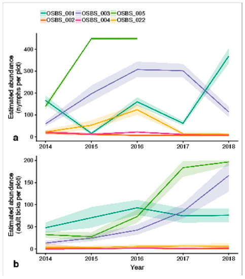 Estimated abundance of (a) nymphs and (b) adult ticks per site (approx. 160 m2). The shaded area is the 95% confidence interval. Site OSBS_005 has no estimates for nymphs for 2017 and 2018 as the model simulated unrealistic exponential growth for these years. Shaded areas are the 95% confidence interval.